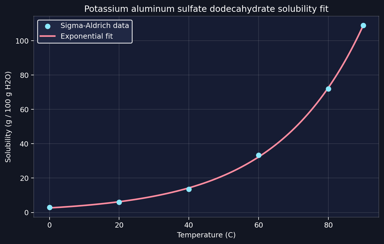 The most interesting code in the project was the part that treated alum as a solubility problem instead of a simple temperature timer. I pulled the empirical alum values from Sigma-Aldrich’s solubility table for compounds in water vs. temperature, specifically the row for aluminum potassium sulfate dodecahydrate, and fit a simple exponential model to that data: