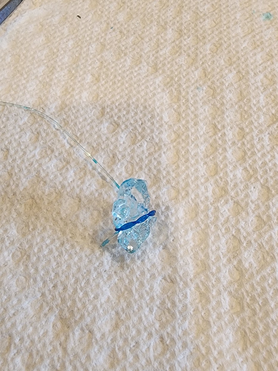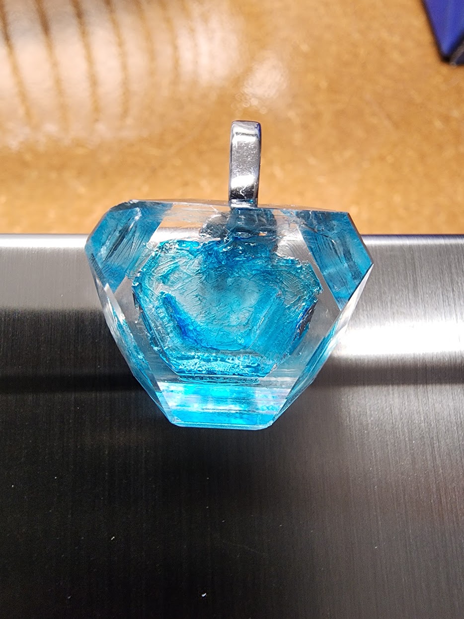 For the bail, I first used super glue directly on the crystal. That did not work very well. I also tried E6000, which worked better, but the bail only became reliably solid once the whole assembly was sealed into epoxy. The practical lesson is that glue can position the hardware, but the cured epoxy needs to become the real structure carrying the load.
